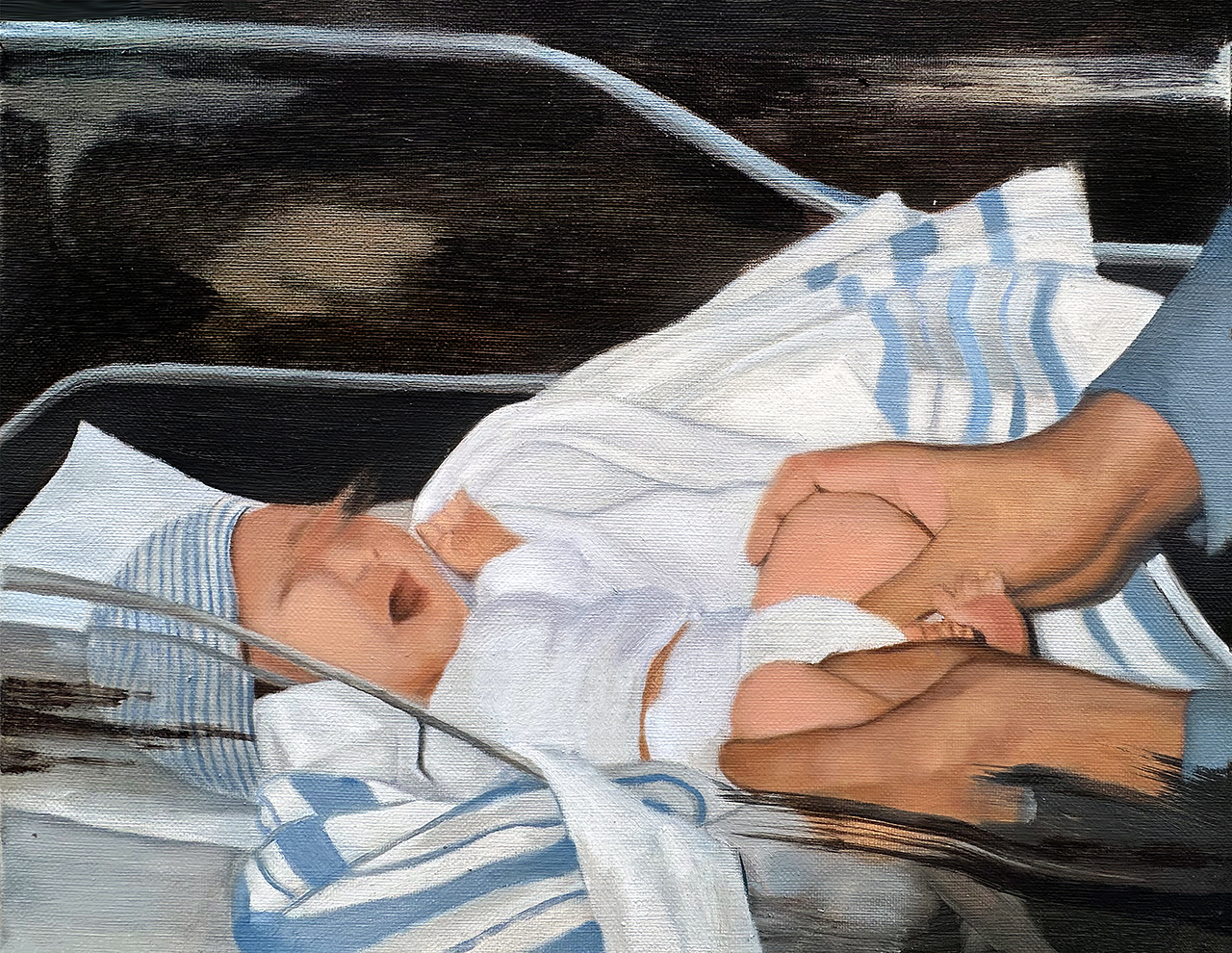 . I work with a foundation of realism to ground my pieces, using it as a reflection of reality. However, I frequently disrupt this realism, allowing elements in a painting to warp, bend, and morph into something more abstract. This visual distortion mirrors the way memories are altered by time and perspective, blurring the line between what is real and what is imagined. Through this process, I hope to offer a cathartic experience that touches on universal themes of vulnerability, identity, and personal history.